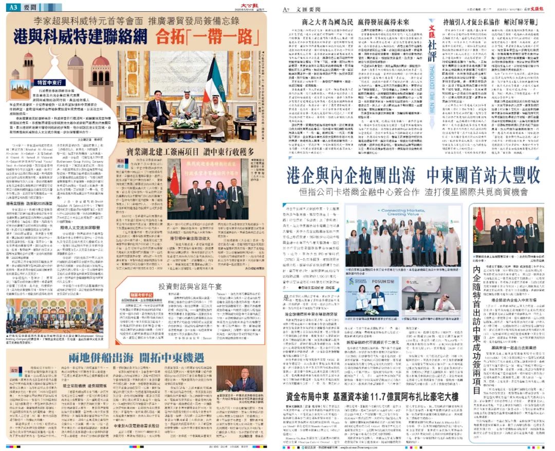 此前,寶業(yè)已承建了由科威特阿拉伯經(jīng)濟發(fā)展基金會在吉布提投資的642套社會住宅、塔朱拉新港等項目,得到多方肯定并榮獲境外工程魯班獎。此次隨團出訪,為寶業(yè)對接中東金融機構(gòu)及香港資源提供了良好的平臺,將加速企業(yè)開拓國際市場,打造“綠色、智能、高效”的基建標(biāo)桿,為經(jīng)濟轉(zhuǎn)型注入“湖北力量”,為國際舞臺上“中國建造”再譜新篇。香港兩大主流媒體《大公報》和《文匯報》聯(lián)合刊文,報道了寶業(yè)此次中東之行取得的豐碩成果。